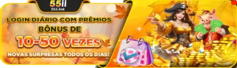 A constância é premiada na 55II através do sistema de check-in diário. Ao acessar sua conta todos os dias, você libera prêmios que variam conforme sua atividade, podendo alcançar bônus de 10 a 50 vezes o valor base da recompensa.